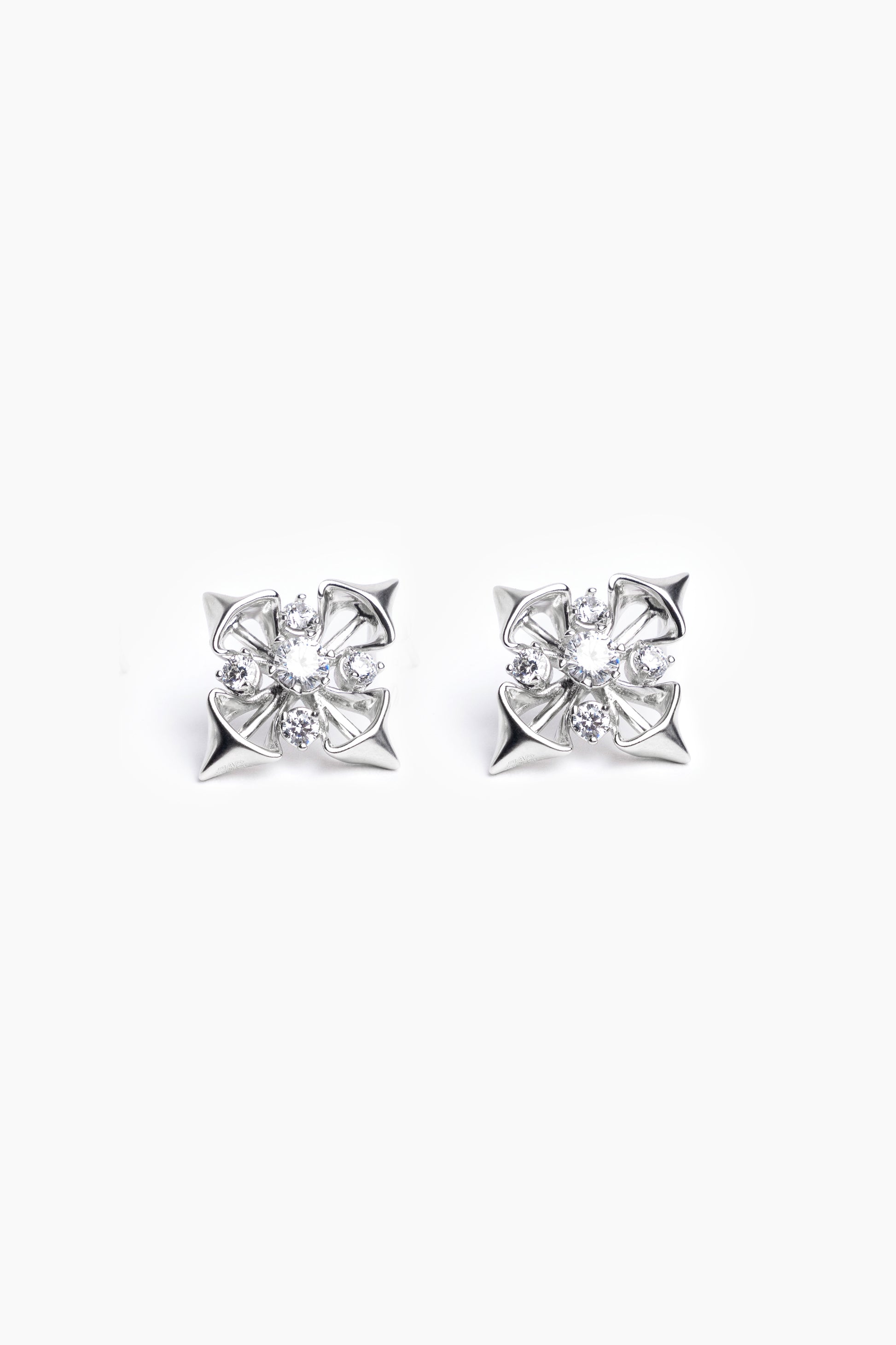 Compact stud earrings shaped by the intersection of a cross and calla lily petals. Finished in platinum plating, designed as a refined symbol worn close to the skin.