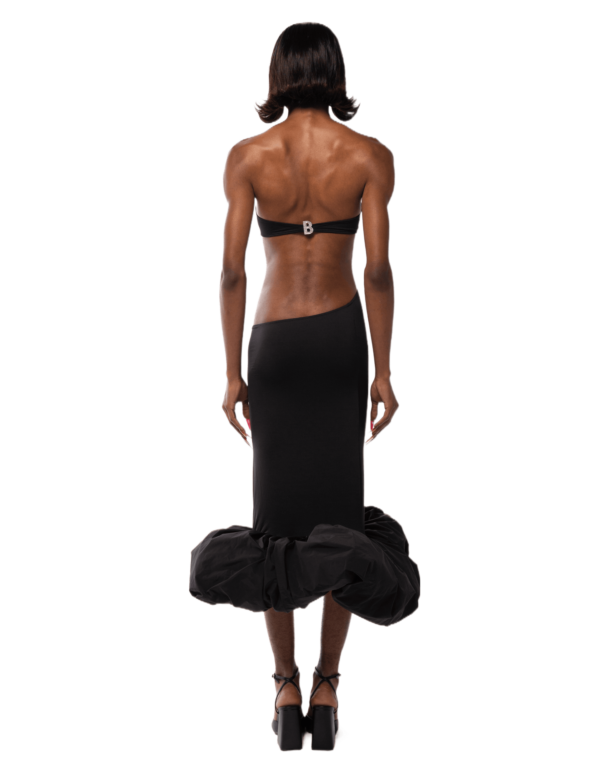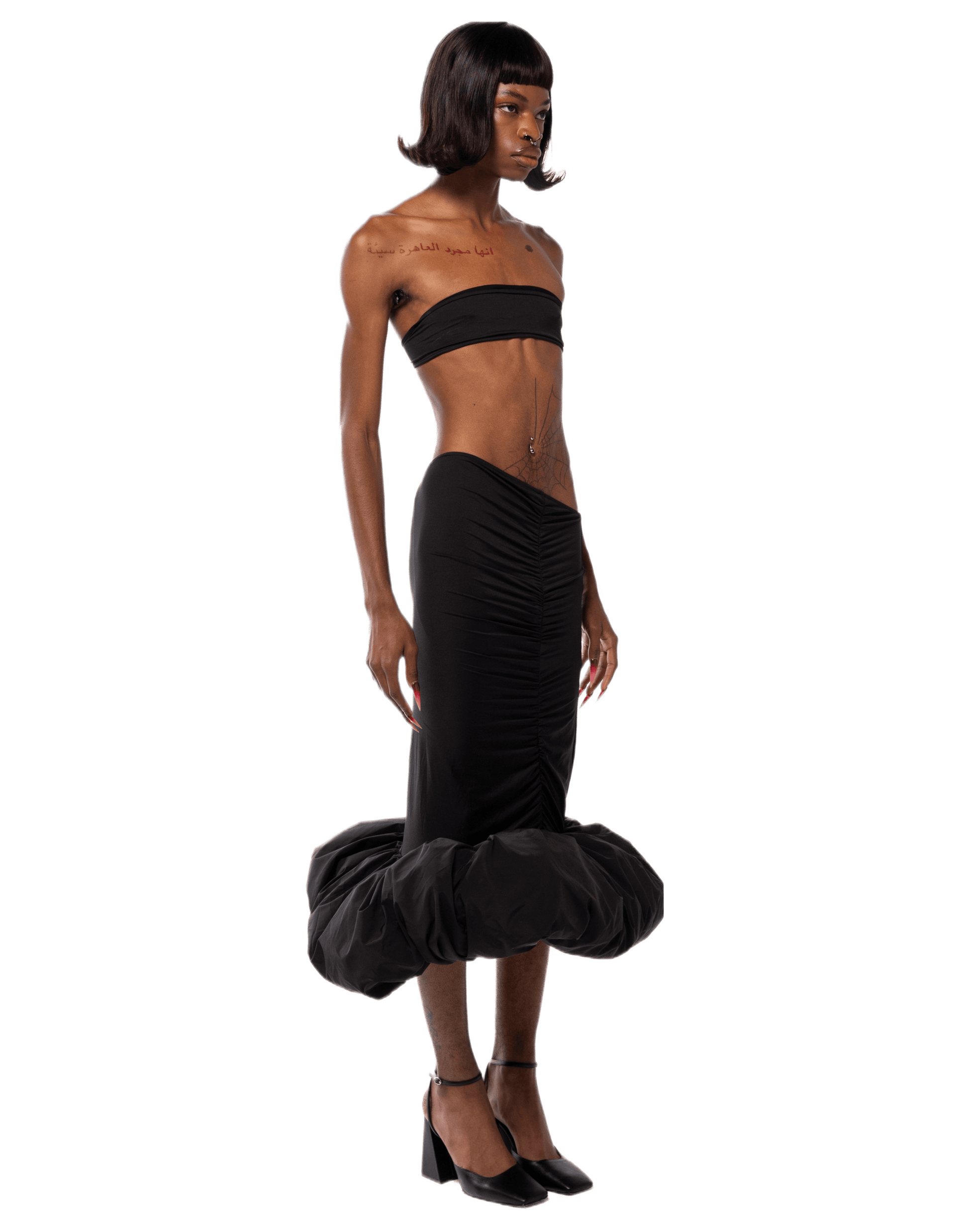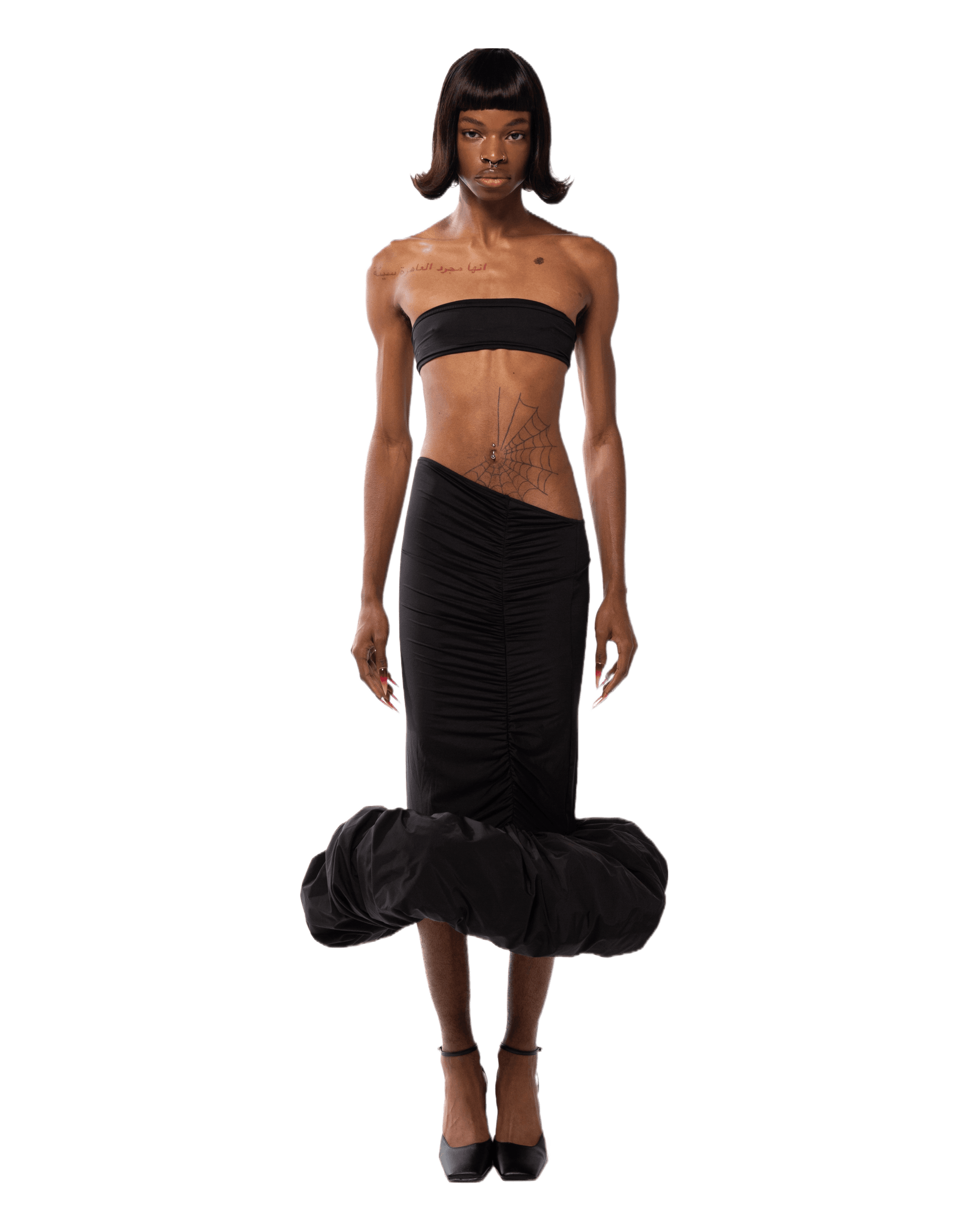 The Cloud Midi Skirt embodies Bad Binch TongTong's affinity for asymmetry and exaggerated silhouettes. The stretchy hourglass construction of the pencil skirt will perfectly showcase your curves topped off with a puff hem for a more romantic take on our iconic Bad Binch TongTong ""Hoop"" silhouette. The asymmetrical waistline accentuates the waist and the lines of the Human body. The garment is high stretch, and is made to fit diverse bodies. 85% Nylon Made in China. Model 1: 6' and is wearing size S. Model 2: 5'8" and is wearing size S. |