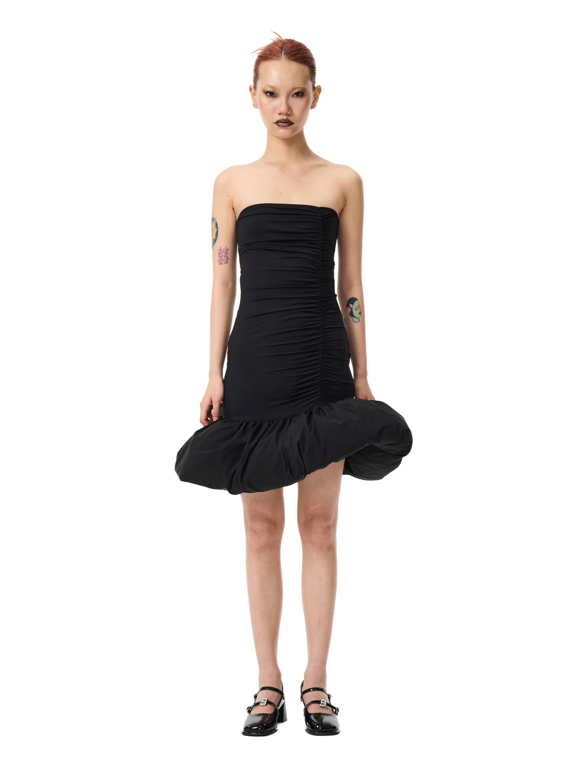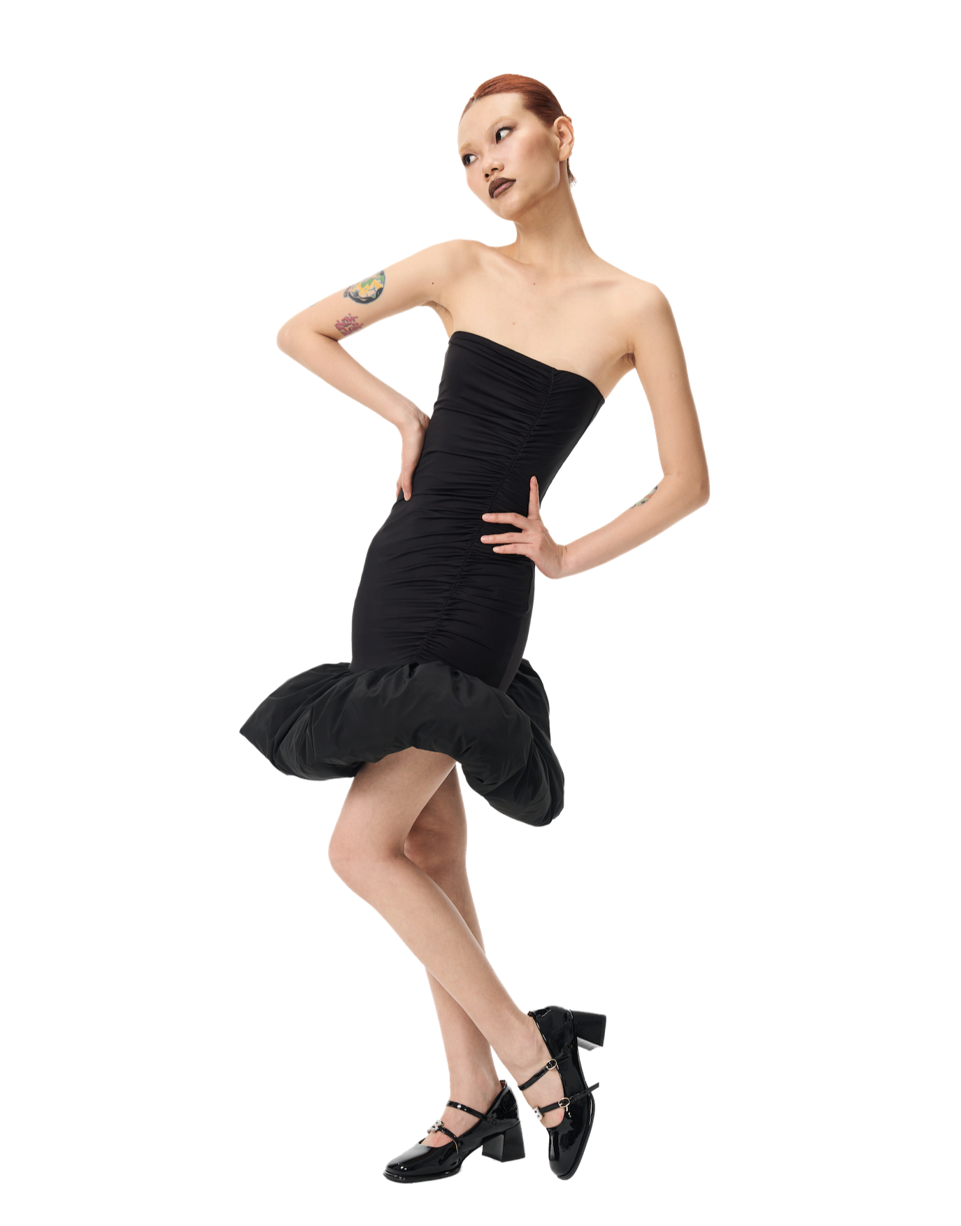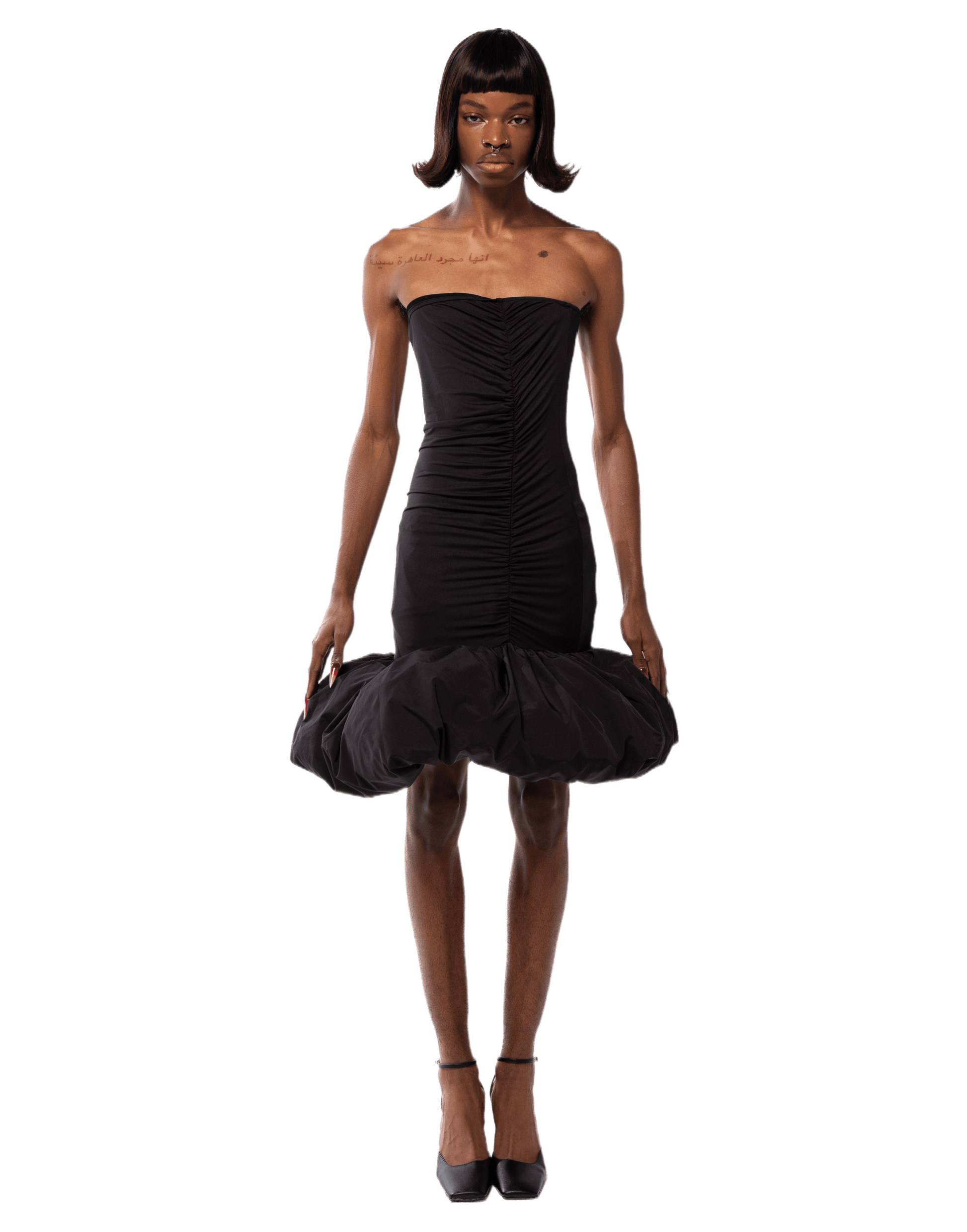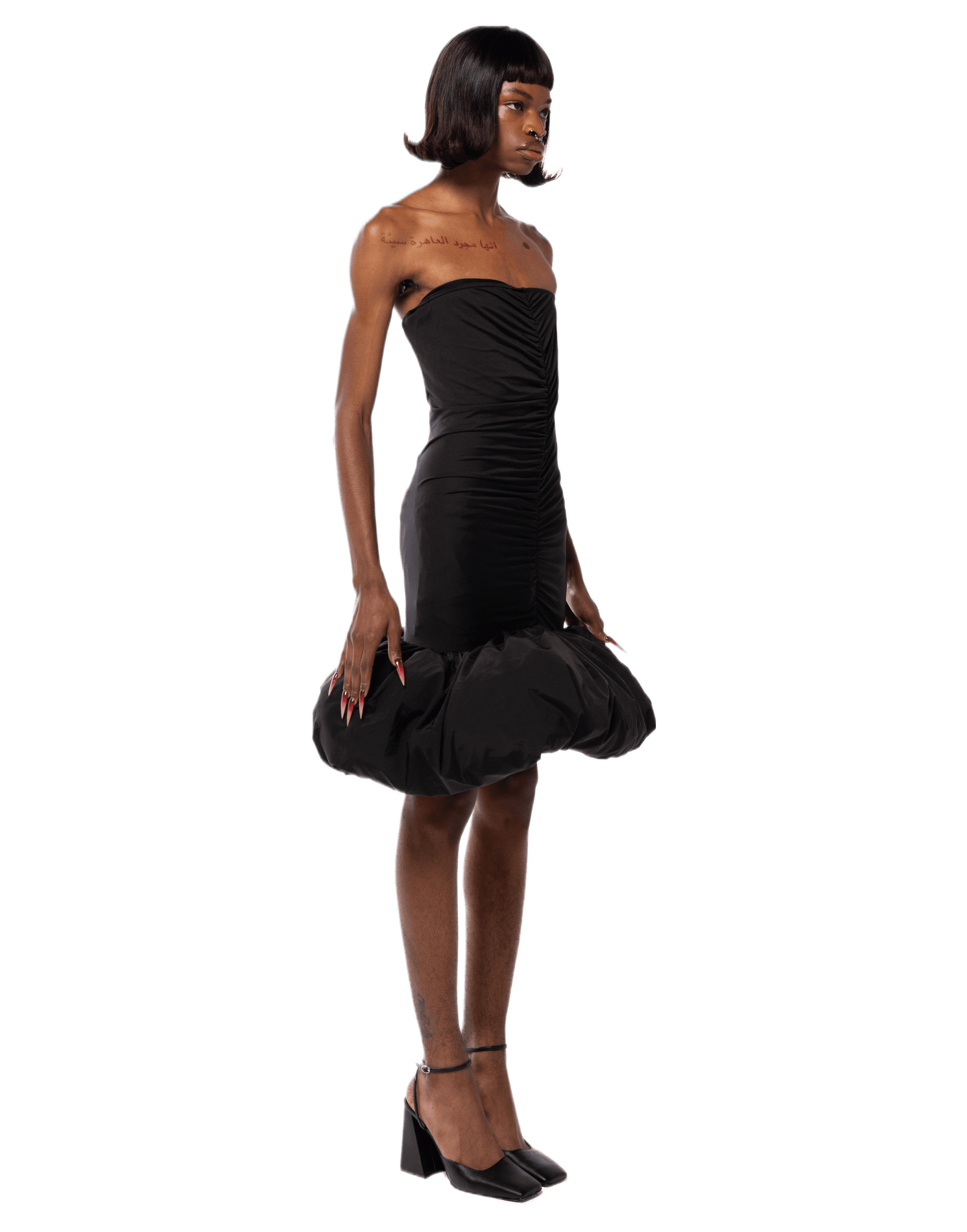 The Cloud Midi Skirt embodies Bad Binch TongTong's affinity for asymmetry and exaggerated silhouettes. The stretchy hourglass construction of the pencil skirt will perfectly showcase your curves topped off with a puff hem for a more romantic take on our iconic Bad Binch TongTong ""Hoop"" silhouette. The asymmetrical waistline accentuates the waist and the lines of the Human body. The garment is high stretch, and is made to fit diverse bodies. 85% Nylon Made in China. Model 1: 6' and is wearing size S. Model 2: 5'8" and is wearing size S. |