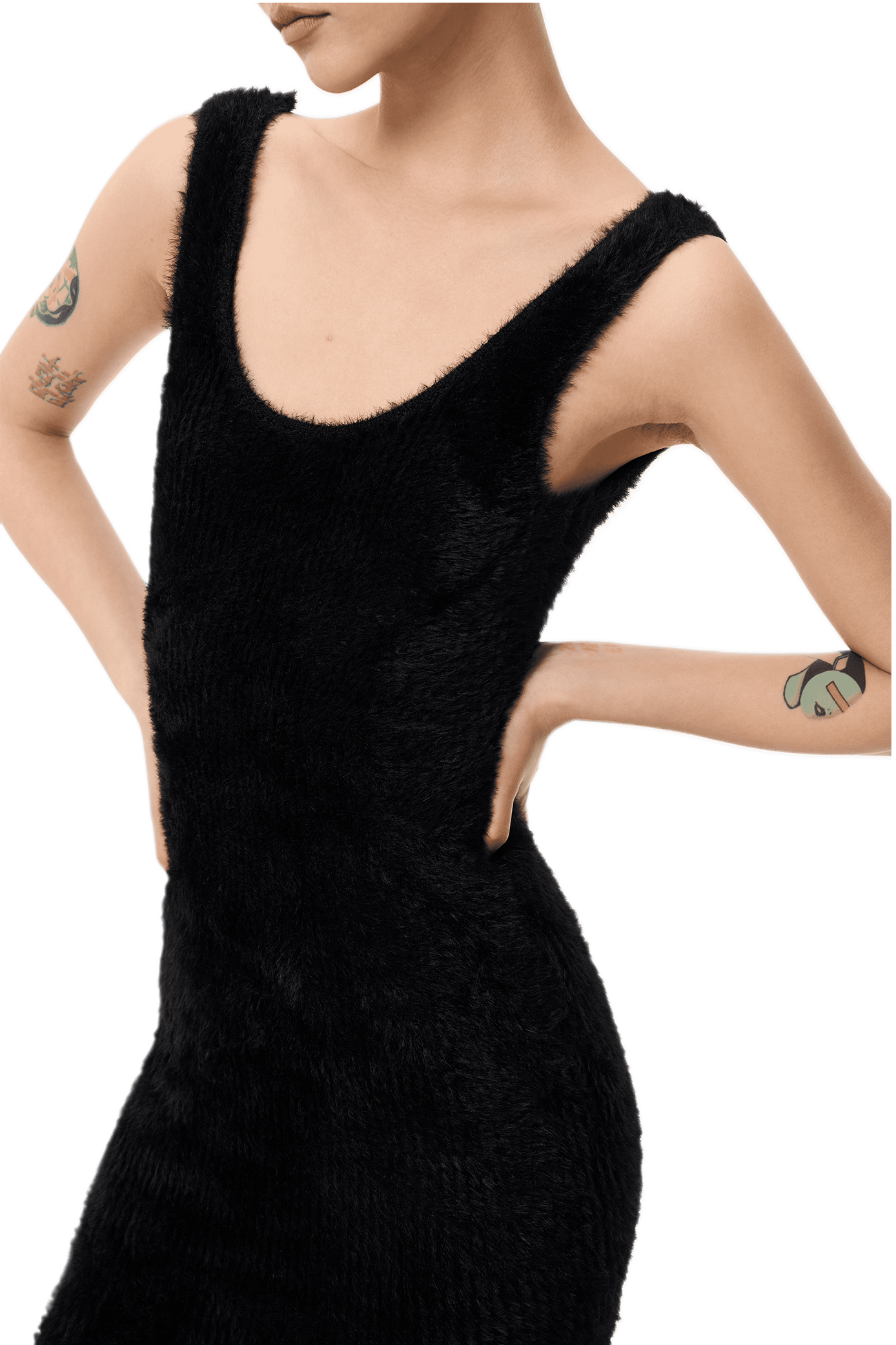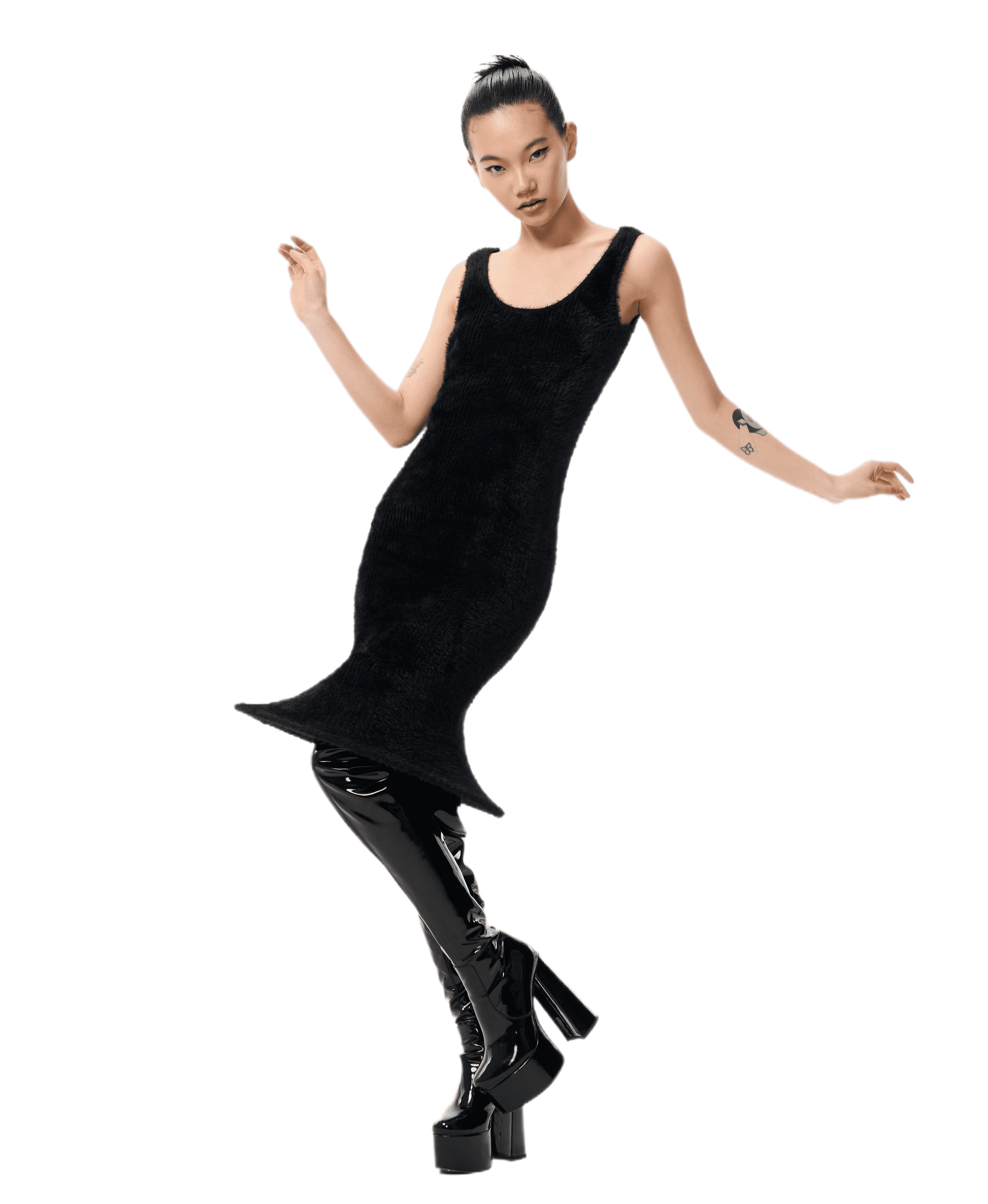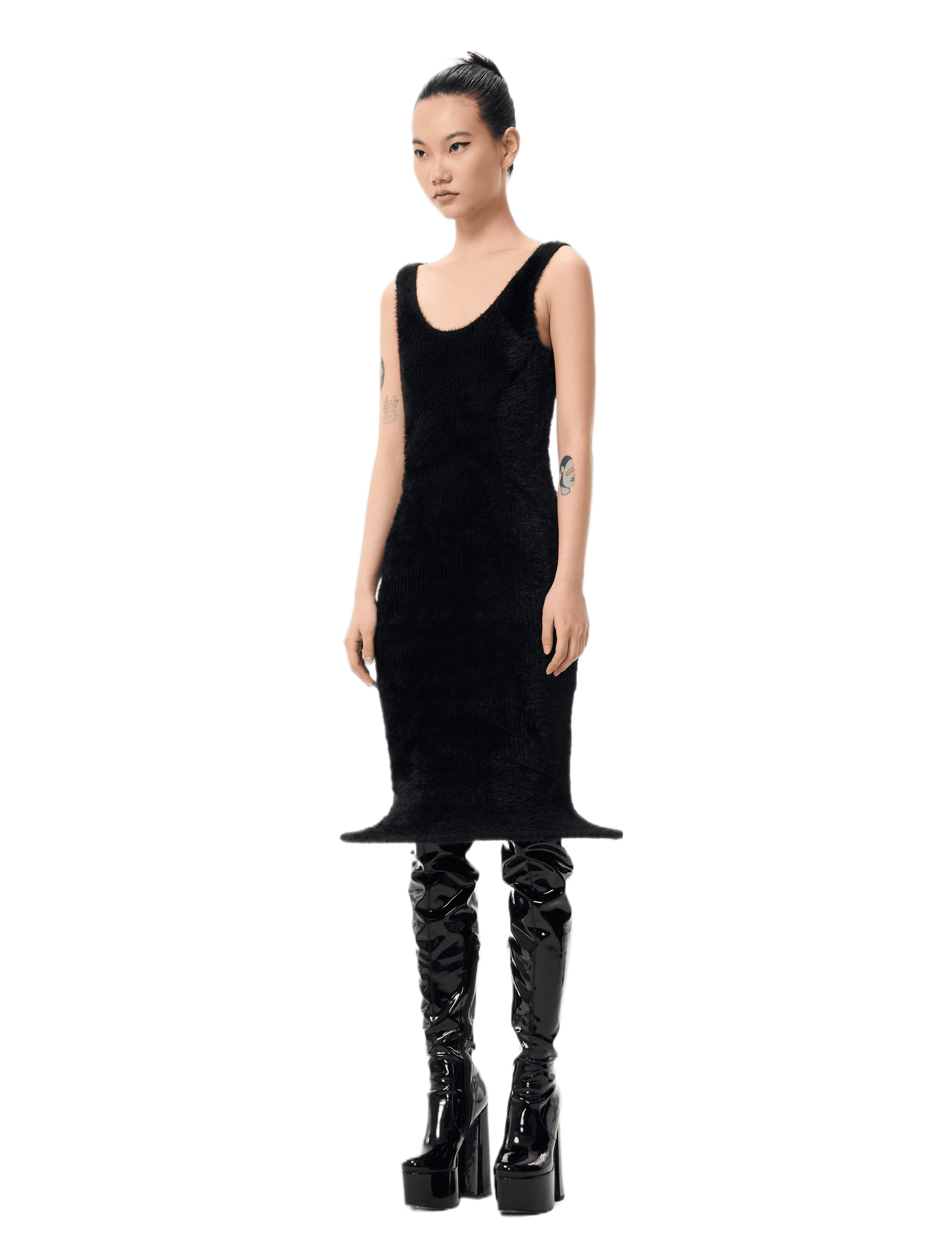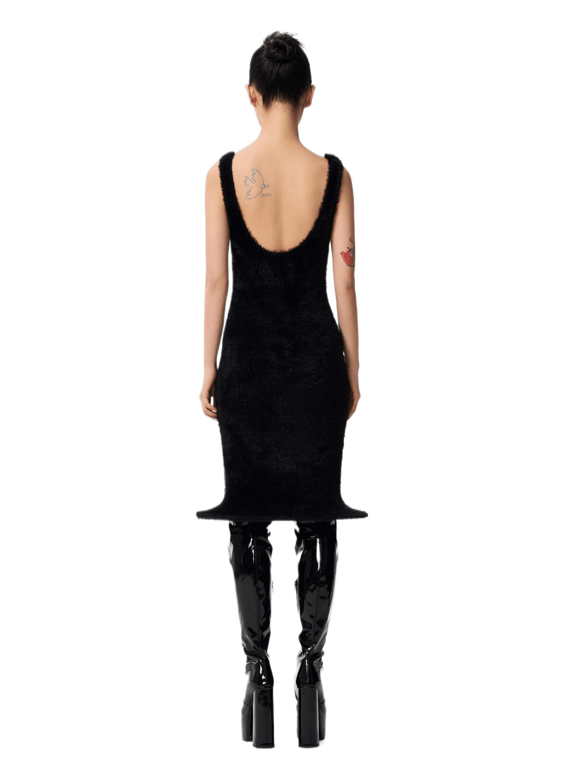 The Furry Knitted Hoop Dress is crafted with modified nylon so to create a "fuzzy" texture and appearance. The stretchy hourglass construction will perfectly showcase you curves topped off with the built in boning at the hem to create our iconic Bad Binch TongTong "Hoop" silhouette. Designed with a scoop style collar, the dress draws attention to the neck, highlighting the collar bones and accessories you might chose to style alongside it. The garment is high stretch, and is made to fit diverse bodies. 100% Nylon. Made in China. The piece is one-size super stretchy and can fit between XS to XXL |