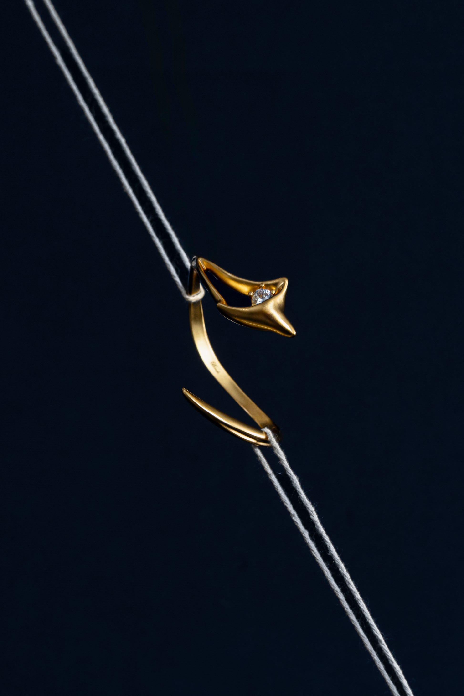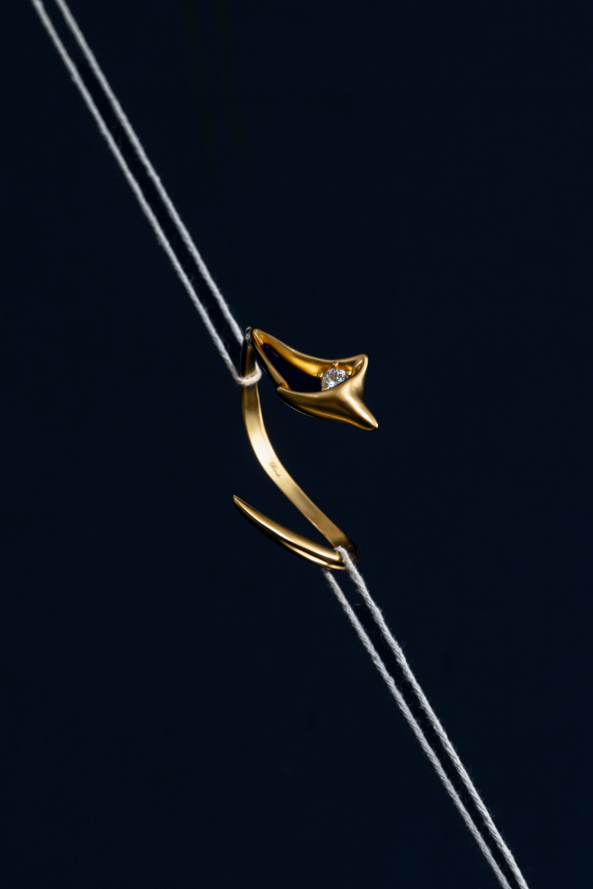 An adjustable cuff bracelet sculpted in an orbital arc, merging celestial motion with the fluid curves of calla lily forms. Finished in 22K gold plating, designed as a modern object in quiet rotation.