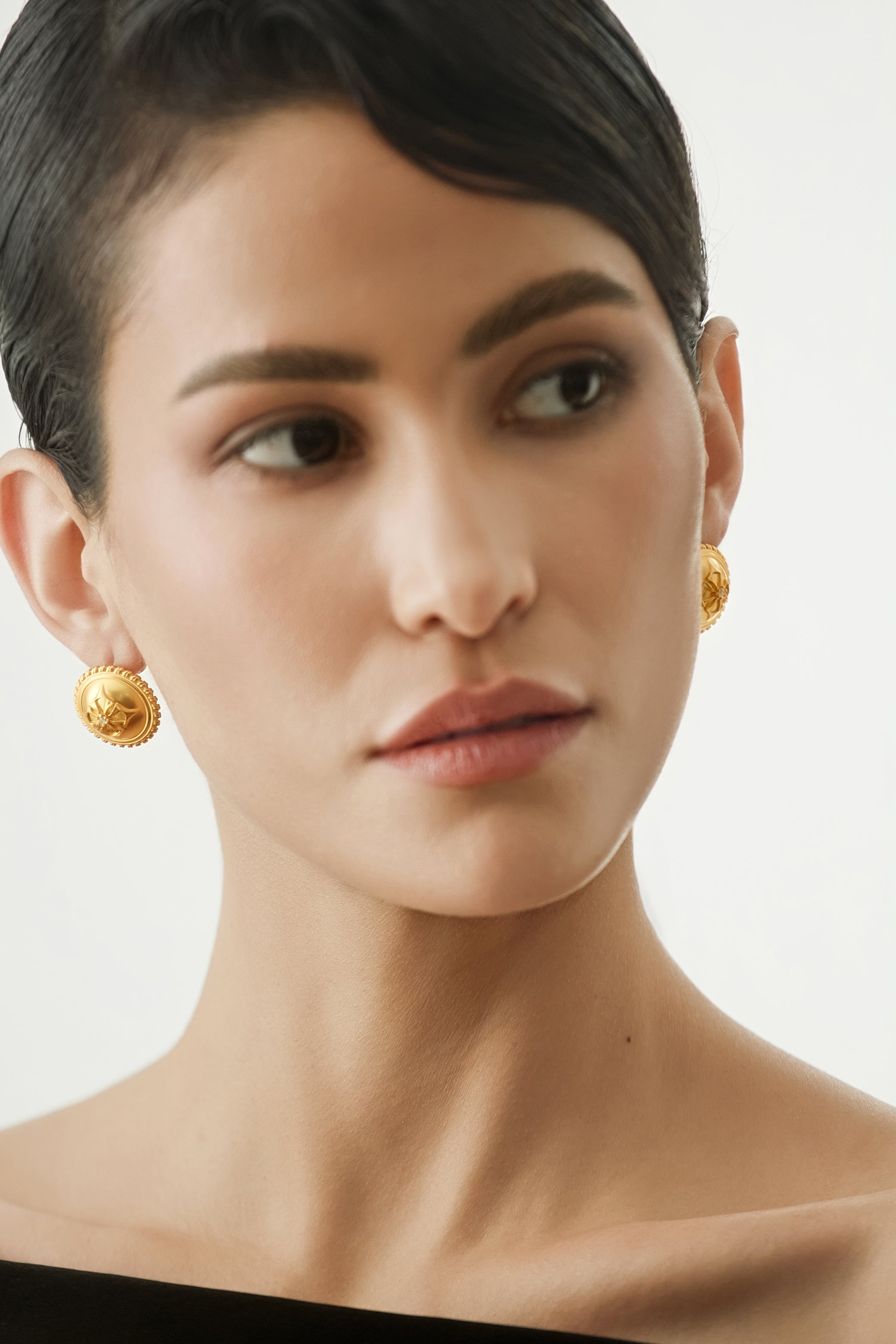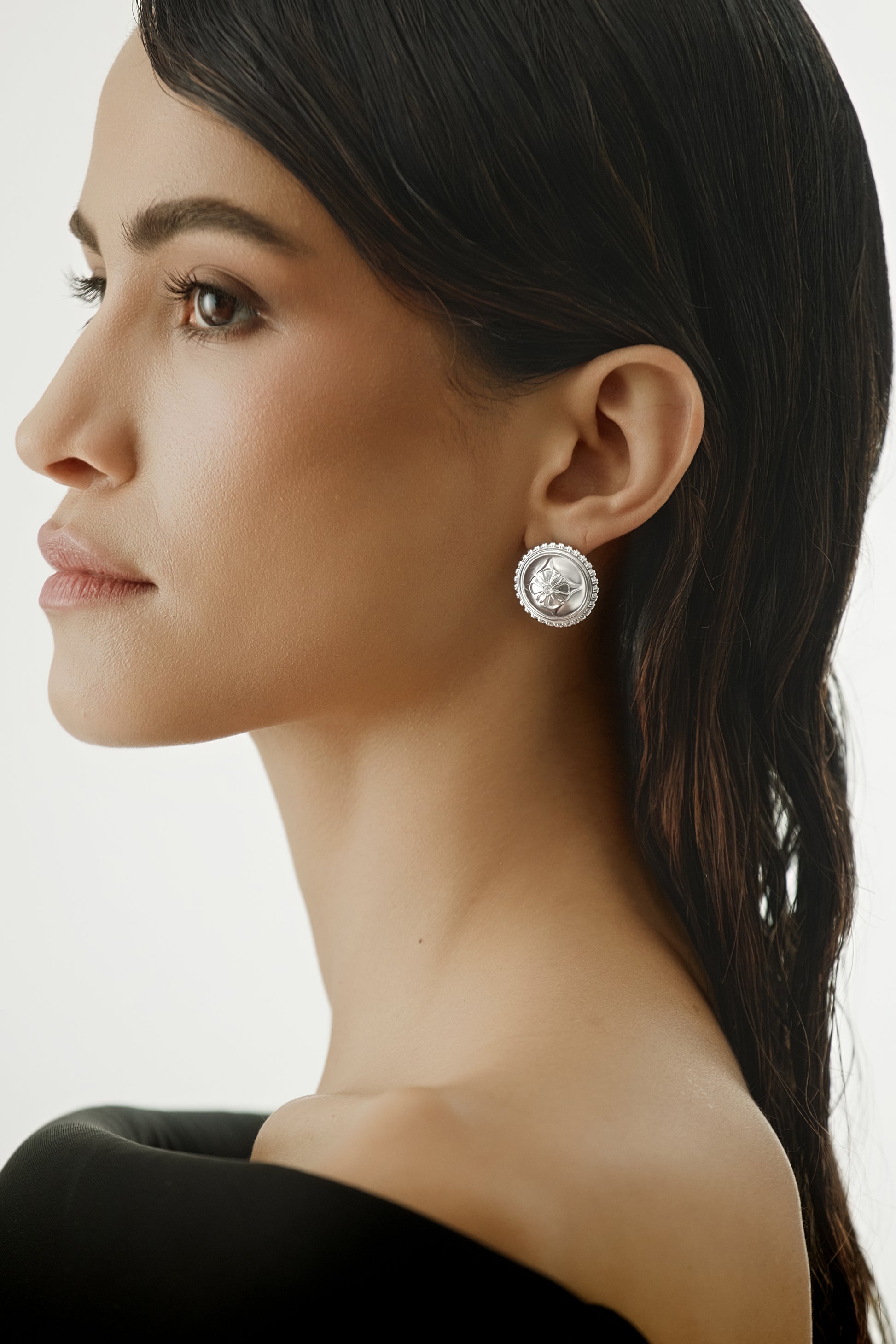 A sculptural stud earring inspired by rope-bound seals and ceremonial buttons. Defined by a raised form and textured edge, designed as a quiet mark of form and commitment.
