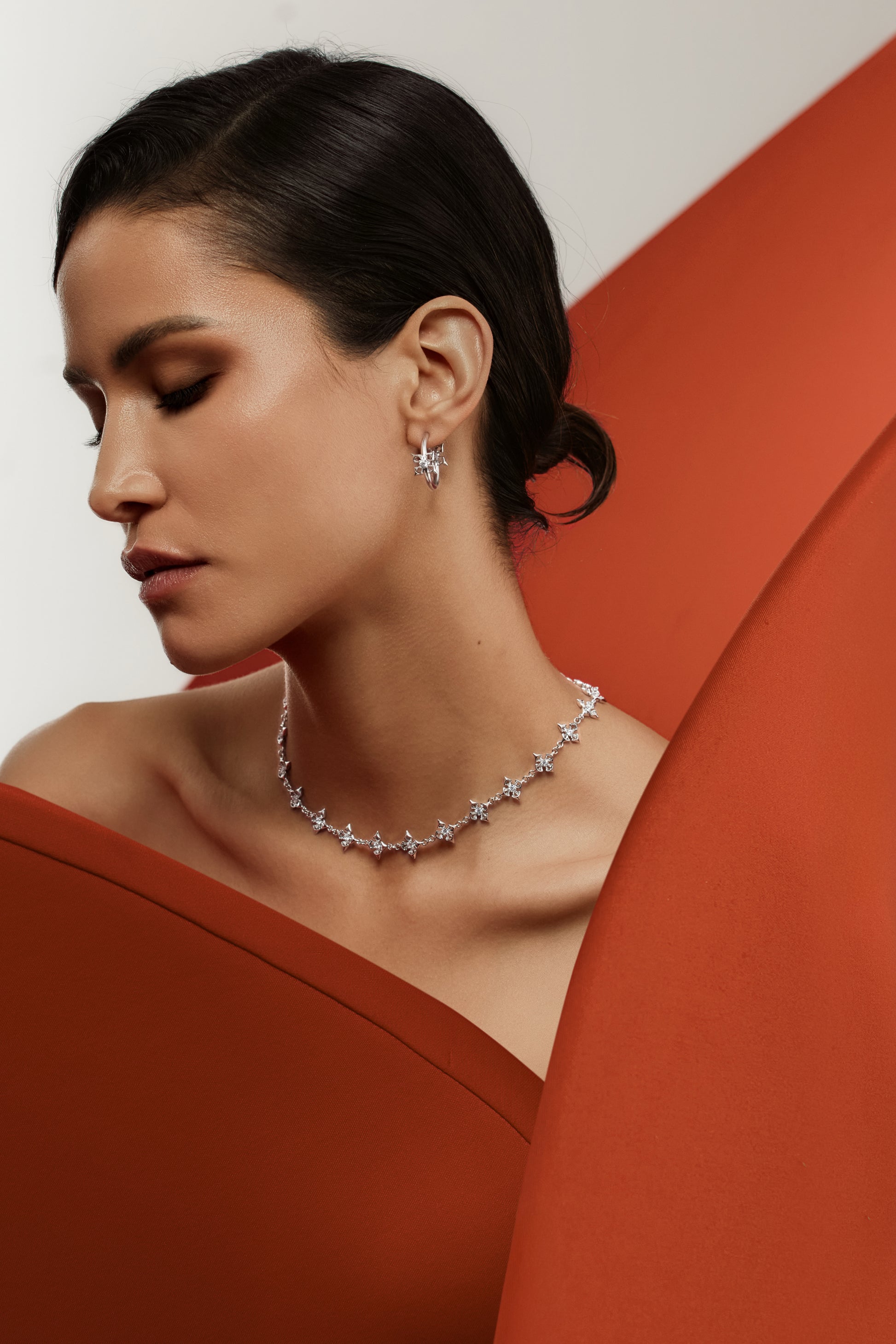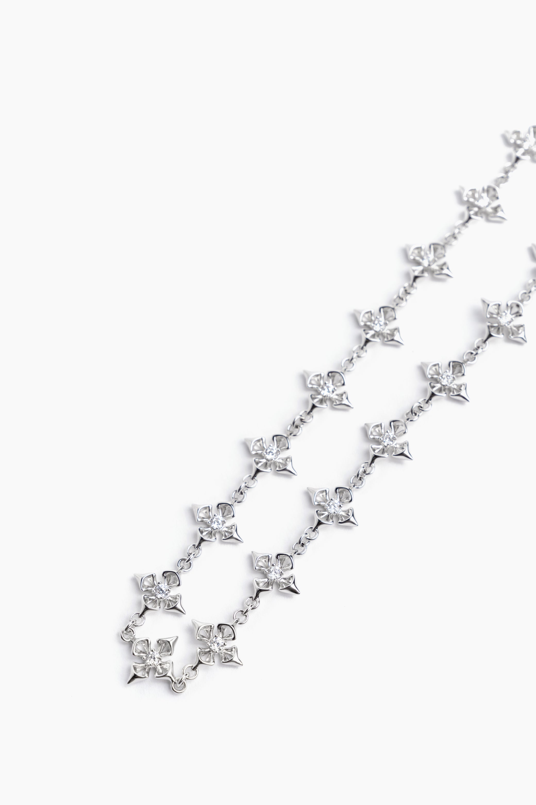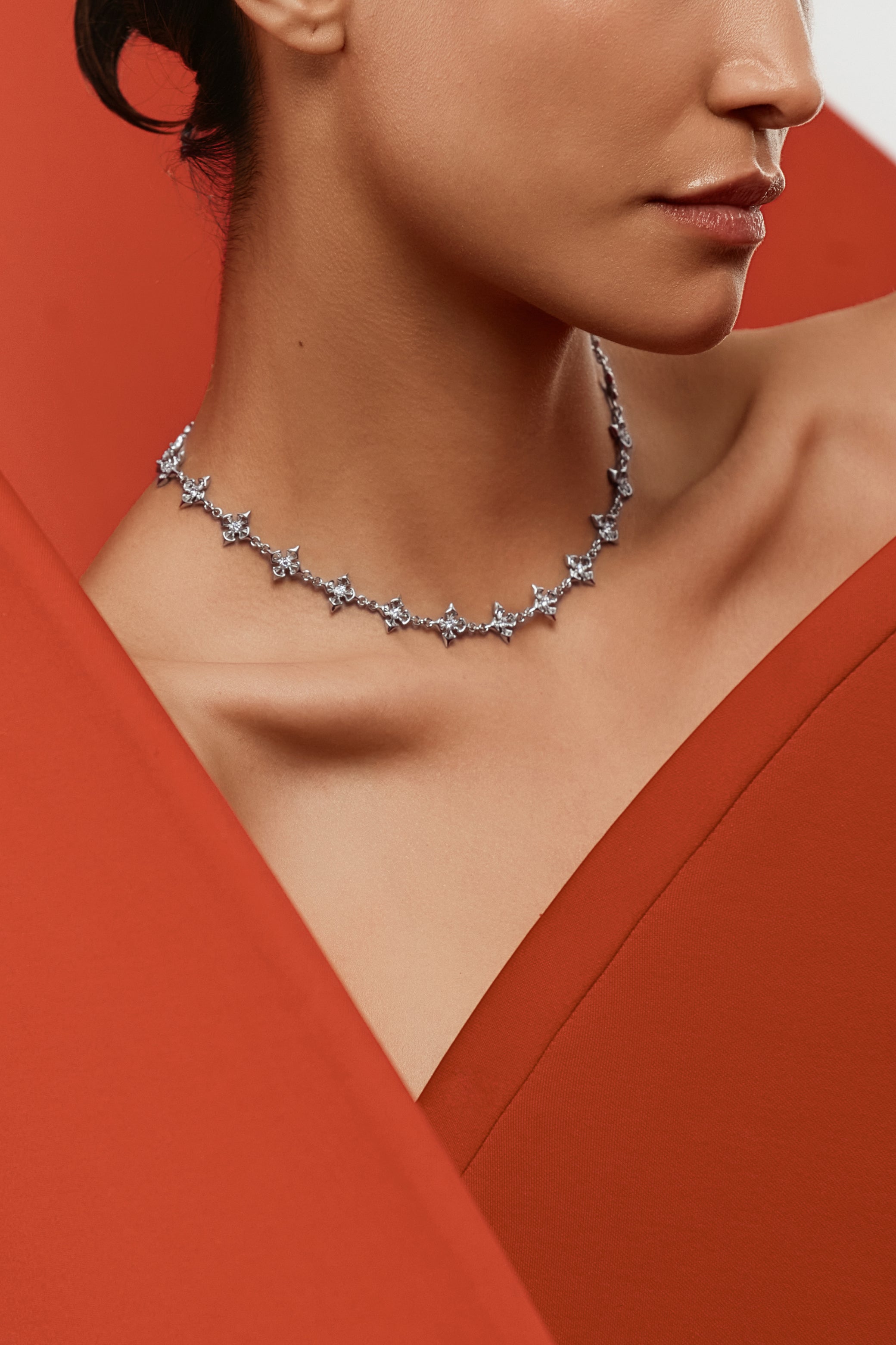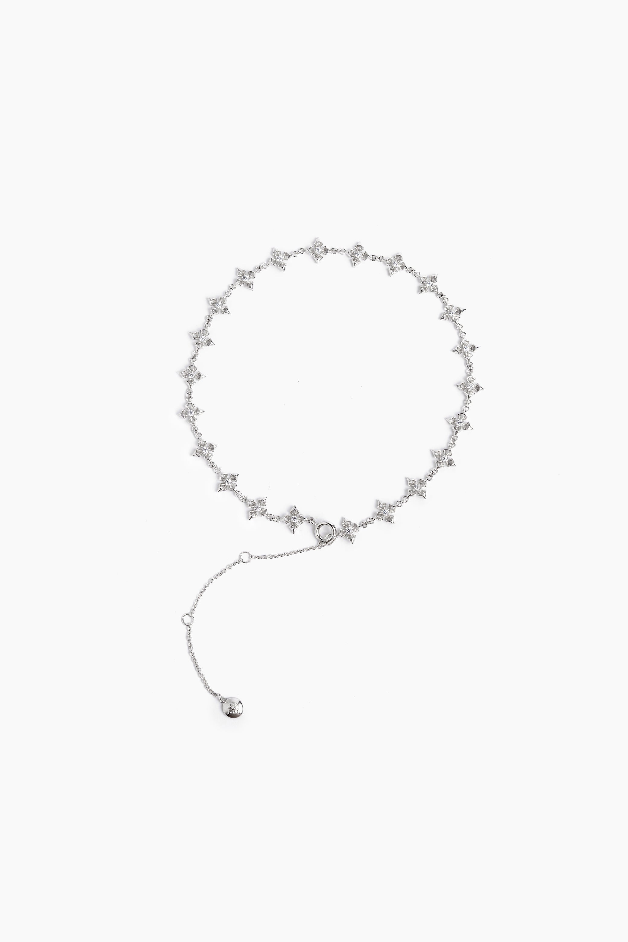 A refined silver-tone choker composed of miniature crosses layered with calla lily motifs. Inspired by wedding rituals and paper vows, the piece rests delicately at the collarbone, balancing devotion, softness, and edge.